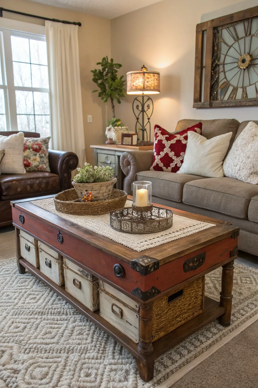 • Vintage Storage Trunk Low Table: Transform your space with a vintage trunk coffee table for style and extra storage.