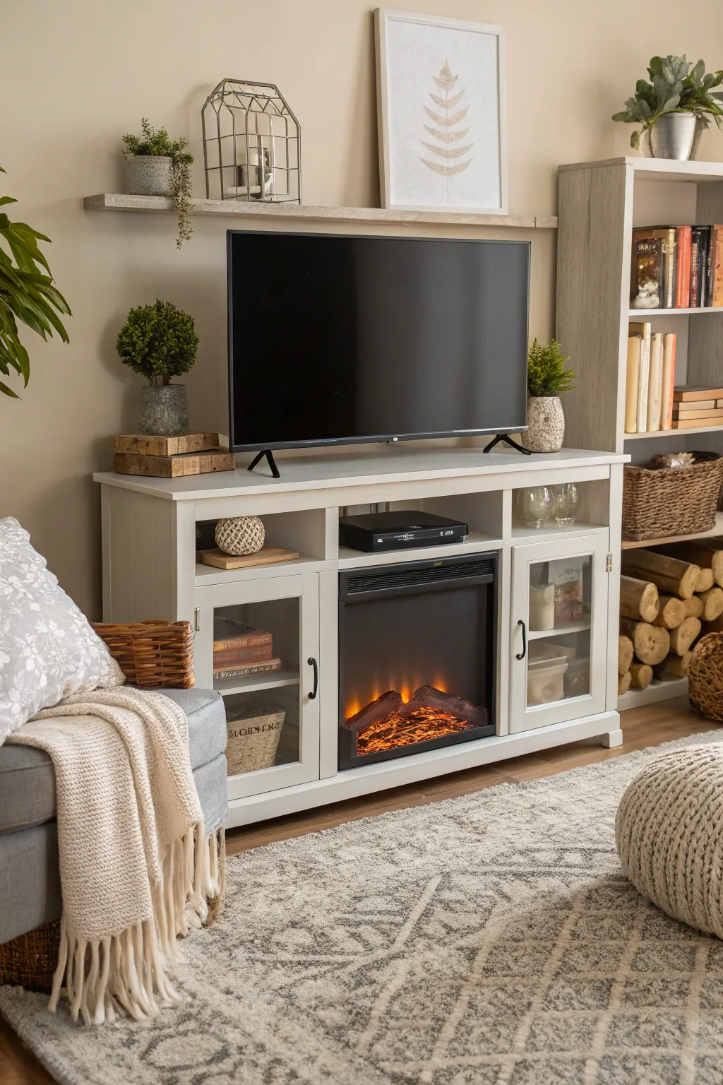- Sleek White Fake Fireplace TV Stand: Make your living room better with a sleek and cozy touch while making the most of storage.