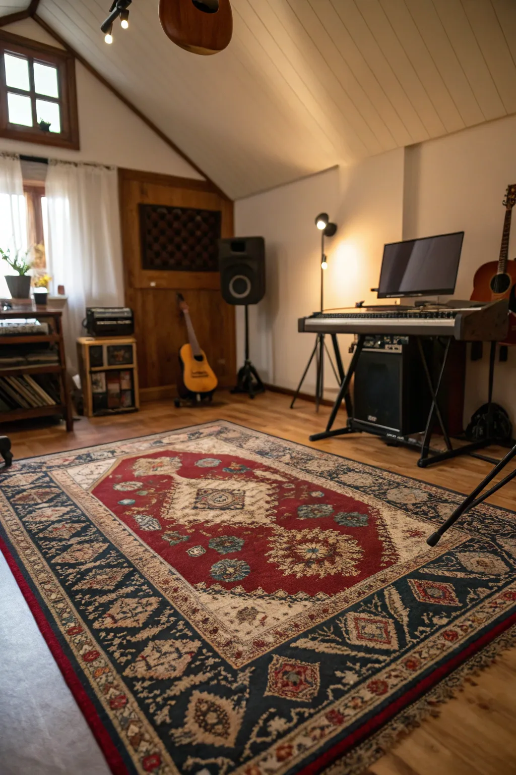 - Plush Patterned Rug: Elevate your music studio’s aesthetics and acoustics with a plush geometric pattern rug. Style meets function.