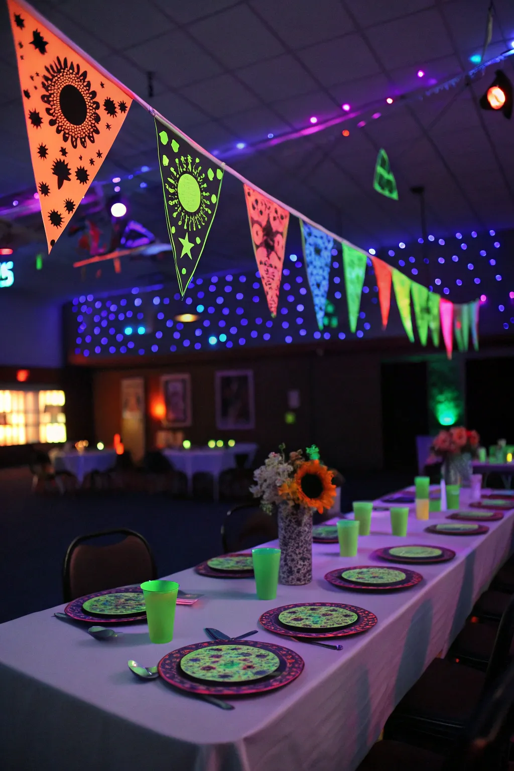 Completely change your celebration area with blacklight ambiance to emphasize all radiant hues. I’ve noticed this phenomenon entirely revamps the room’s essence, creating an almost otherworldly shimmer throughout.