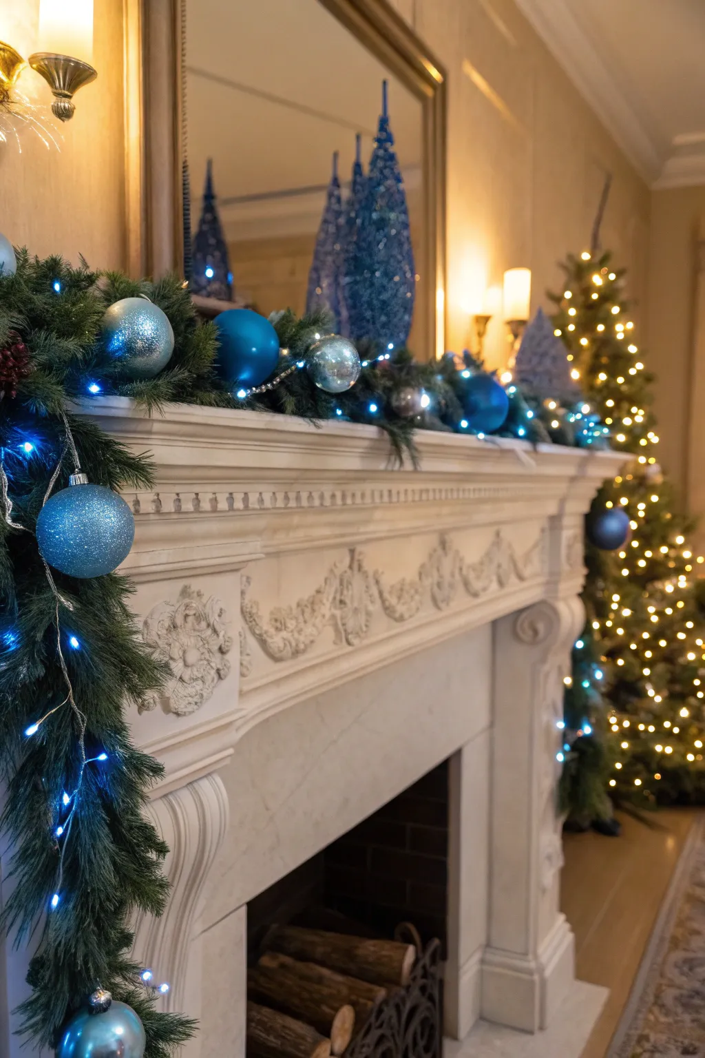 Embellish your fireplace surround with azure festoons and ethereal lights to evoke a snug ambiance. Integrate azure and snow-white ornaments to unite the composition. I cherish how this imbues my lounge with the essence of a tranquil winter refuge.