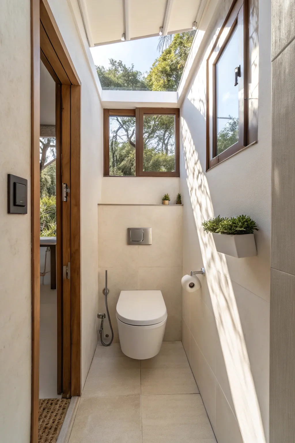 To give the bathroom more warmth and texture, add timber trims surrounding the toilet. I have used this hint of rustic appeal to blend natural and contemporary designs.