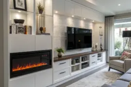 Envision integrated shelving surrounding your TV to achieve a unified aesthetic and offer extra storage solutions. This arrangement provides a cohesive appearance, seamlessly merging your TV into the room’s overall design.