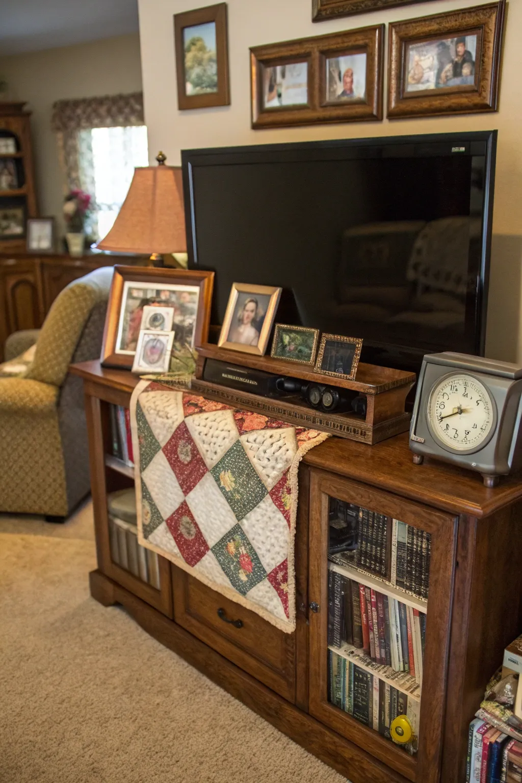 Display items that hold personal value to make your TV stand truly yours. I always include pieces that narrate a tale and spark happiness.