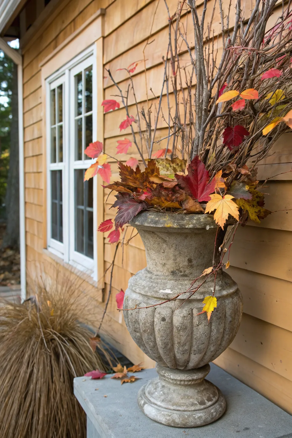 Bring in woody stems and autumn-colored leaves to evoke a rustic appeal. It’s a straightforward yet impactful method to channel the natural magnificence of autumn straight to your doorstep.