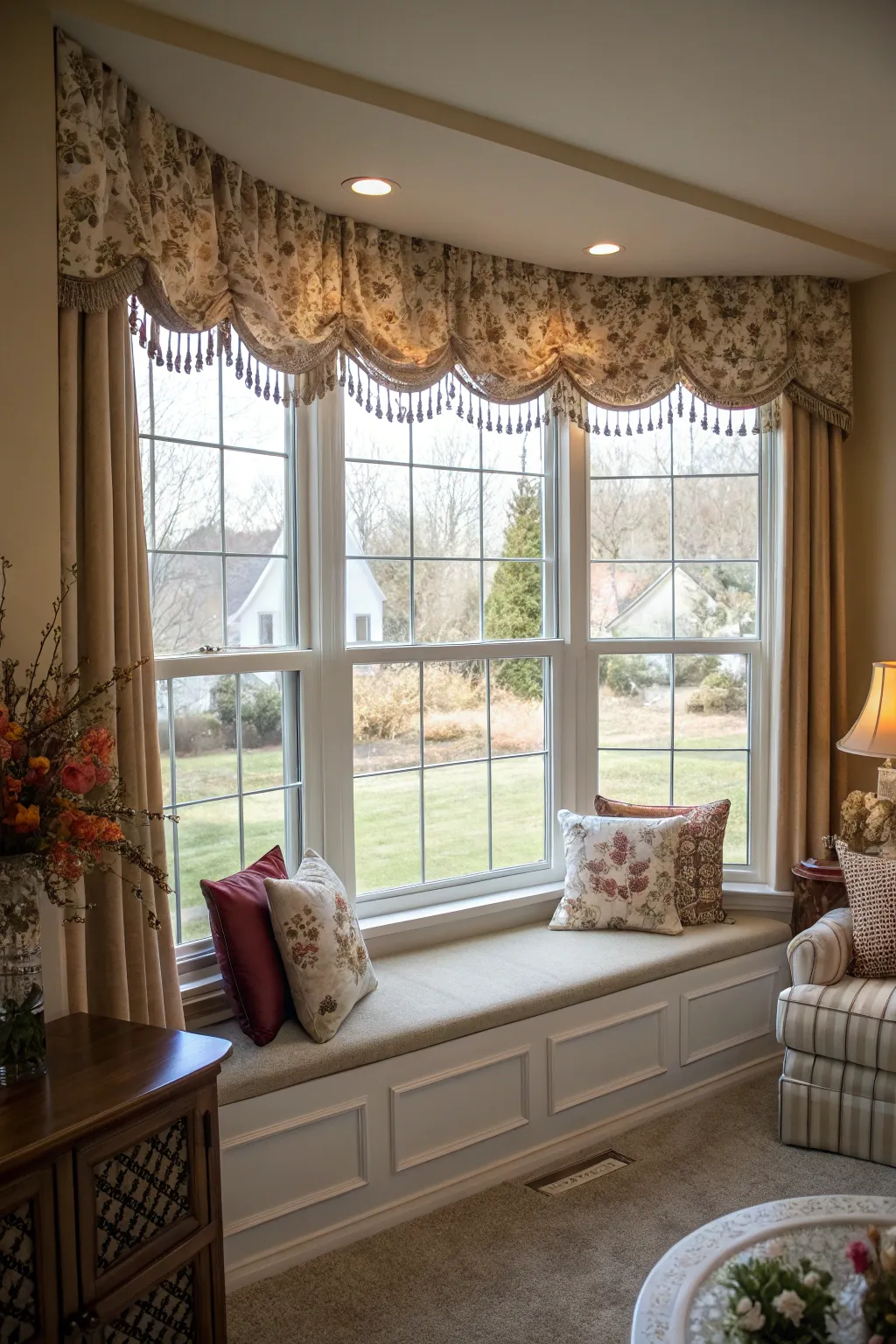 Introduce a burst of character to your bay windows with bold valances with designs. I’m particularly fond of employing detailed botanical or geometric patterns to establish a striking visual center in any space.