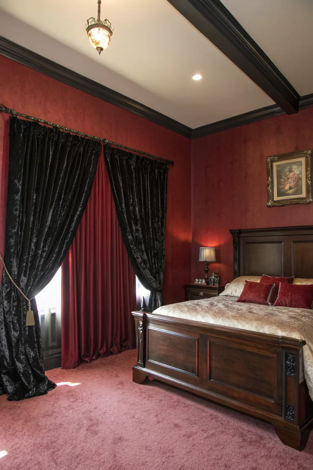 Frame your windows with heavy, luxurious curtains to add drama and depth. Drapery is a simple way to enhance the room’s gothic elegance and provide privacy.