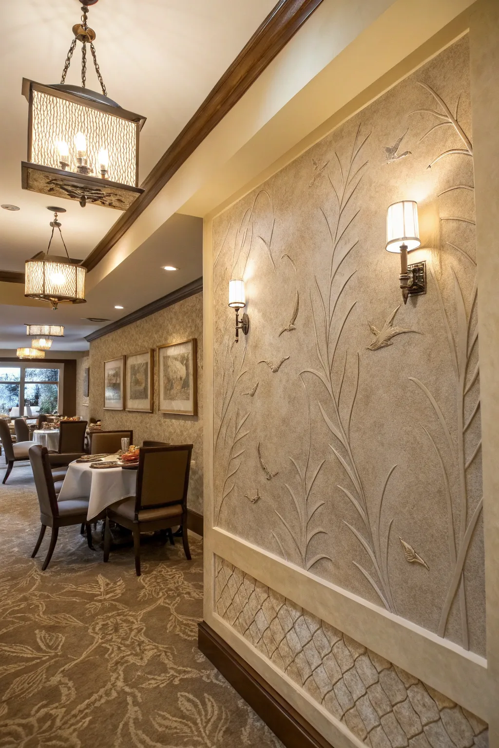 Test out the grain curl method for a lively, inventive vibe. Using a wide applicator and a gritty base coat, I’ve playfully curled my way to a distinctive wall that functions as a captivating point of interest.