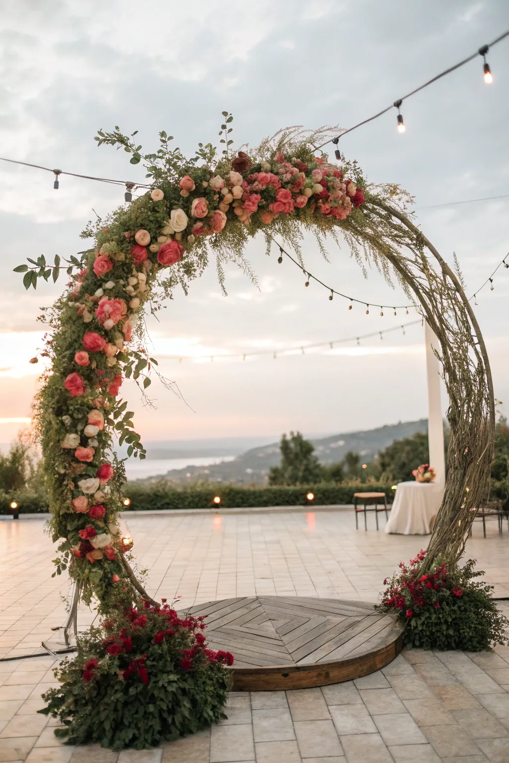 A circular wedding arch symbolizes eternity and union. I find joy in crafting these with interlaced vines and blossoms to accentuate the symbolism of endless love.